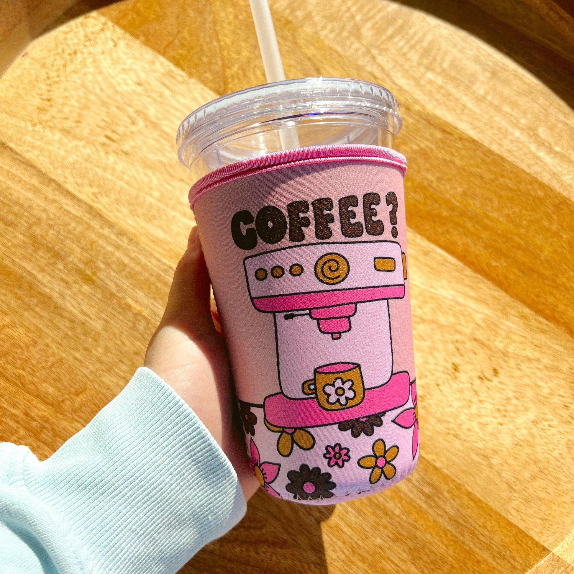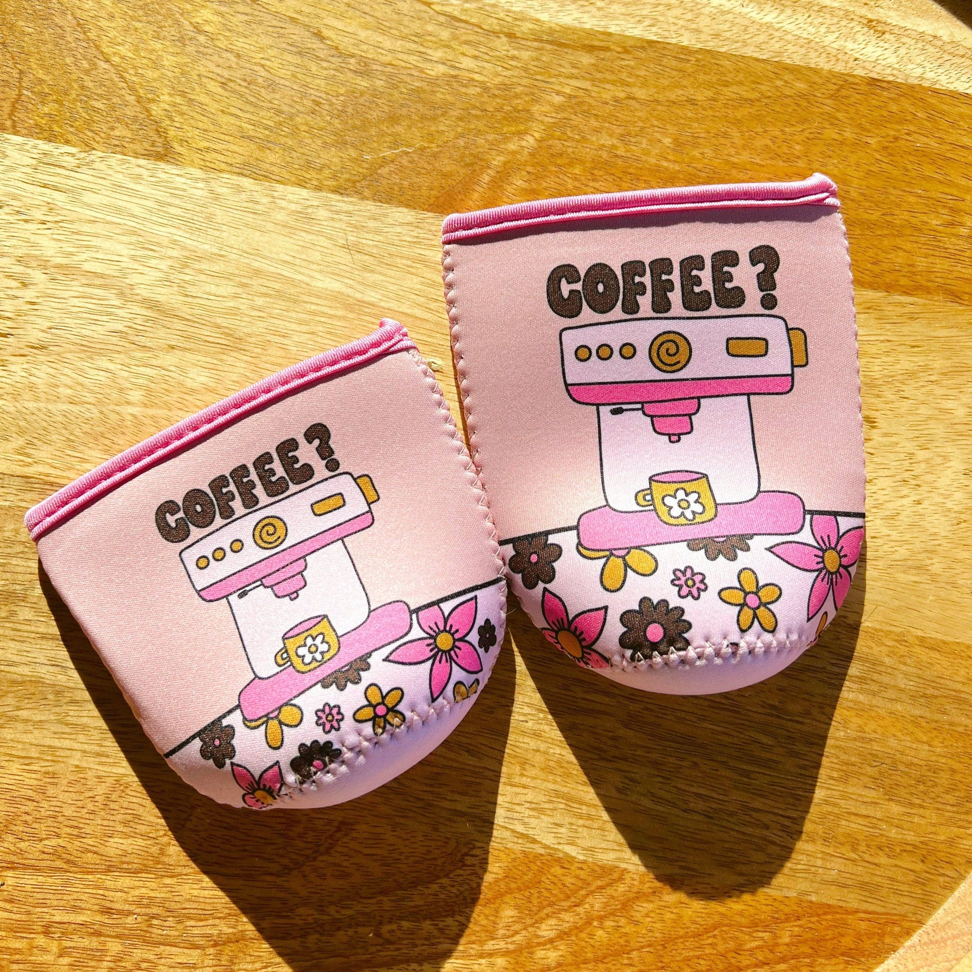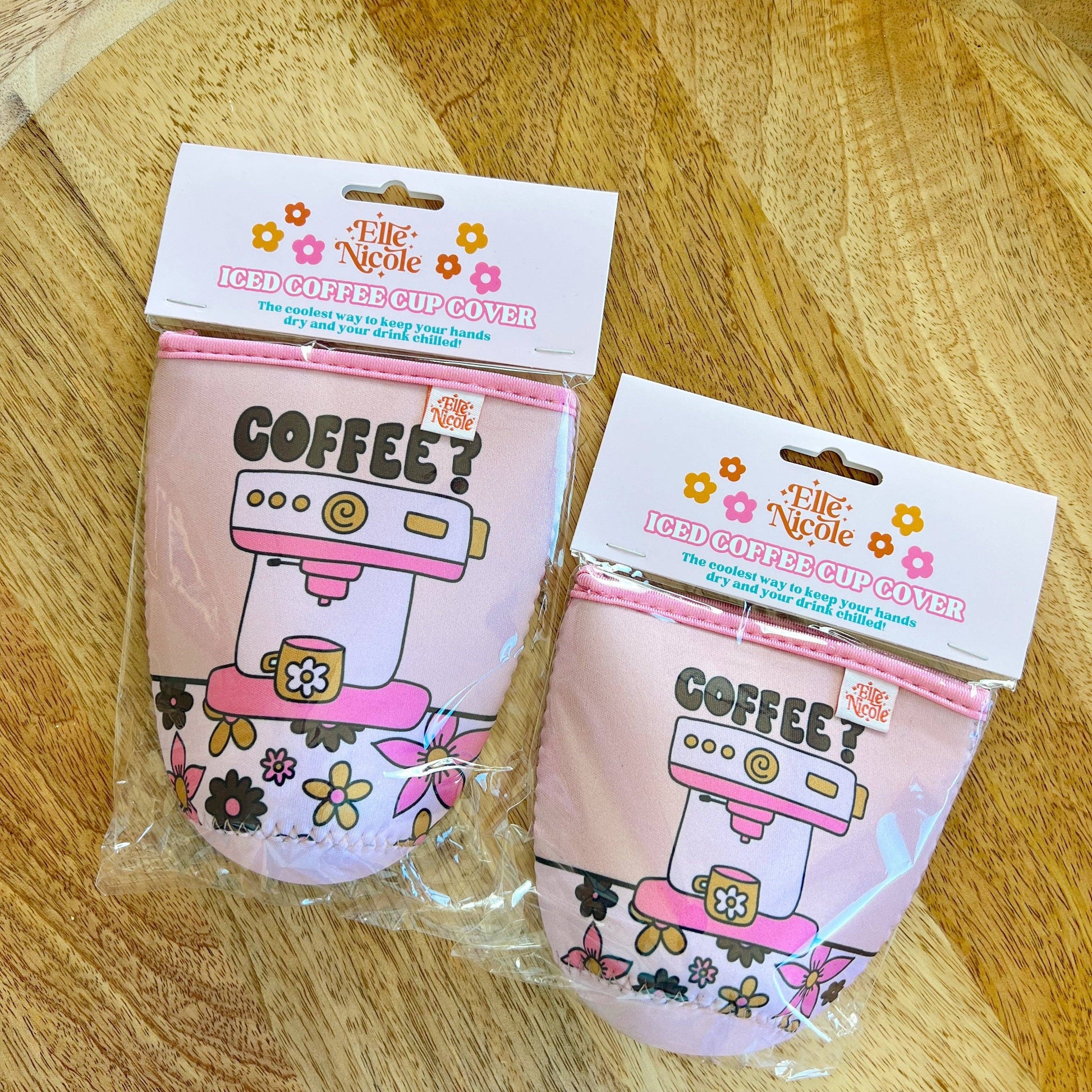 Stay cool and covered with this Cutie Cup Cover! Put your own stylish spin on your cup with Ellē Nicole's hand-drawn retro florals - the perfect fusion of fashion and function! The neoprene material insulates your cup, keeping your beverage cooled while also keeping your hands nice and dry. It comes in two sizes: small for grande / 16oz and large for venti / 24oz - so you can keep your drinks chill no matter the size! This design features a pink, brown and floral espresso machine doodle with the words "Coffee" it's so cute!