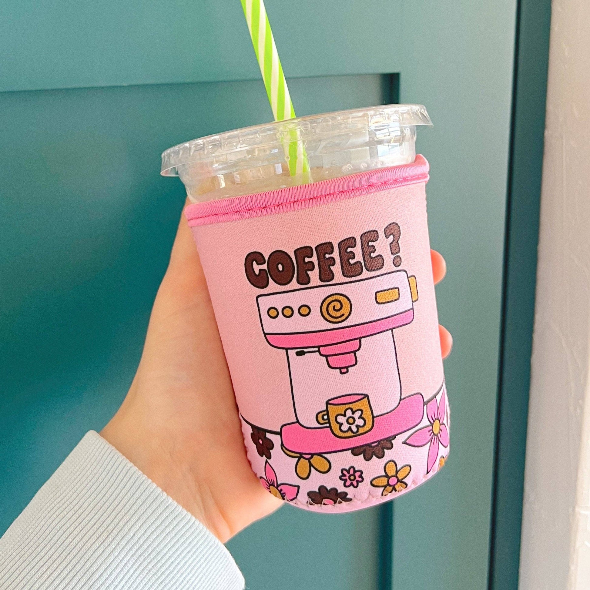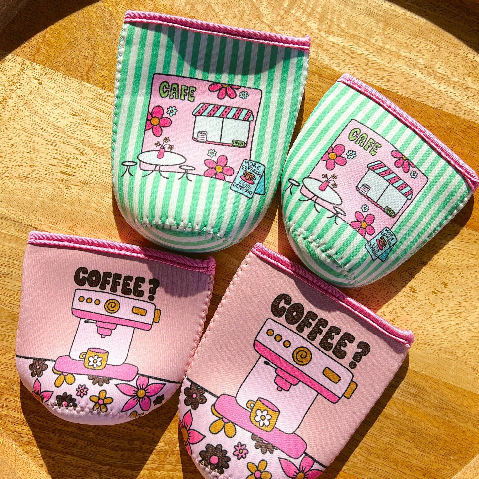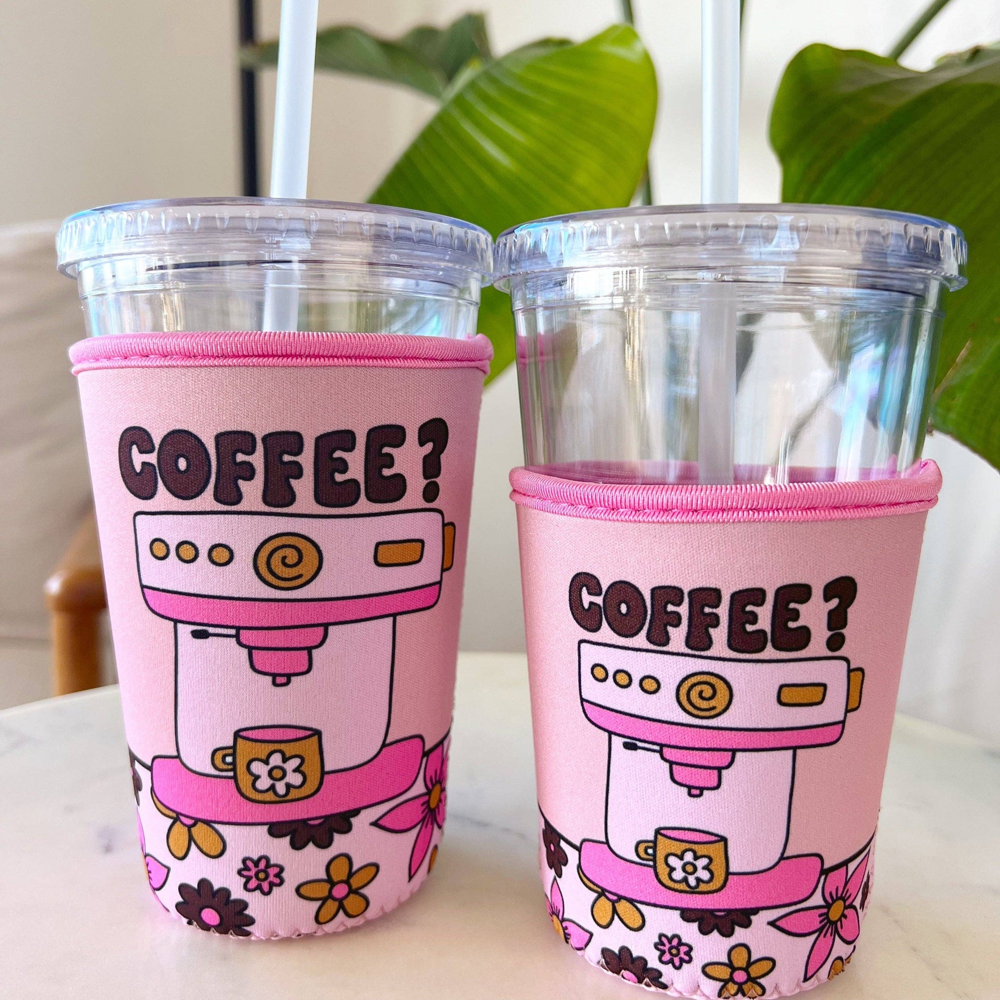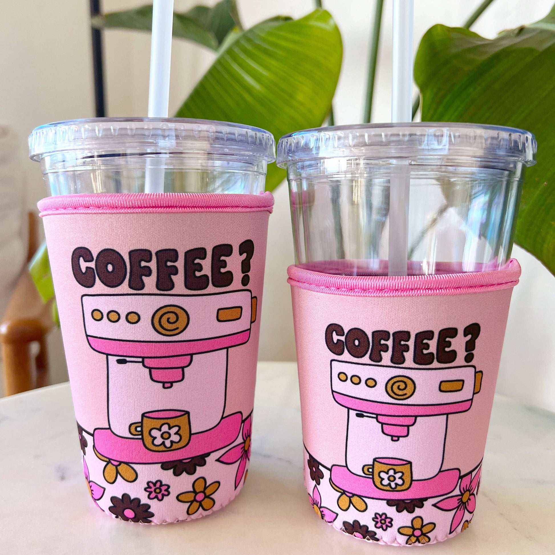 Stay cool and covered with this Cutie Cup Cover! Put your own stylish spin on your cup with Ellē Nicole's hand-drawn retro florals - the perfect fusion of fashion and function! The neoprene material insulates your cup, keeping your beverage cooled while also keeping your hands nice and dry. It comes in two sizes: small for grande / 16oz and large for venti / 24oz - so you can keep your drinks chill no matter the size! This design features a pink, brown and floral espresso machine doodle with the words "Coffee" it's so cute!