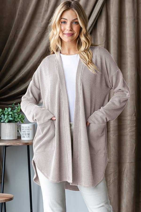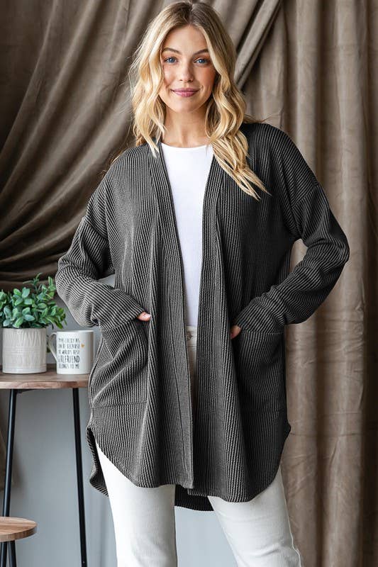 LONG SLEEVE SOLID URBAN RIBBED OPEN CARDIGAN WITH FRONT POCKET AND ROUND HEM DETAIL