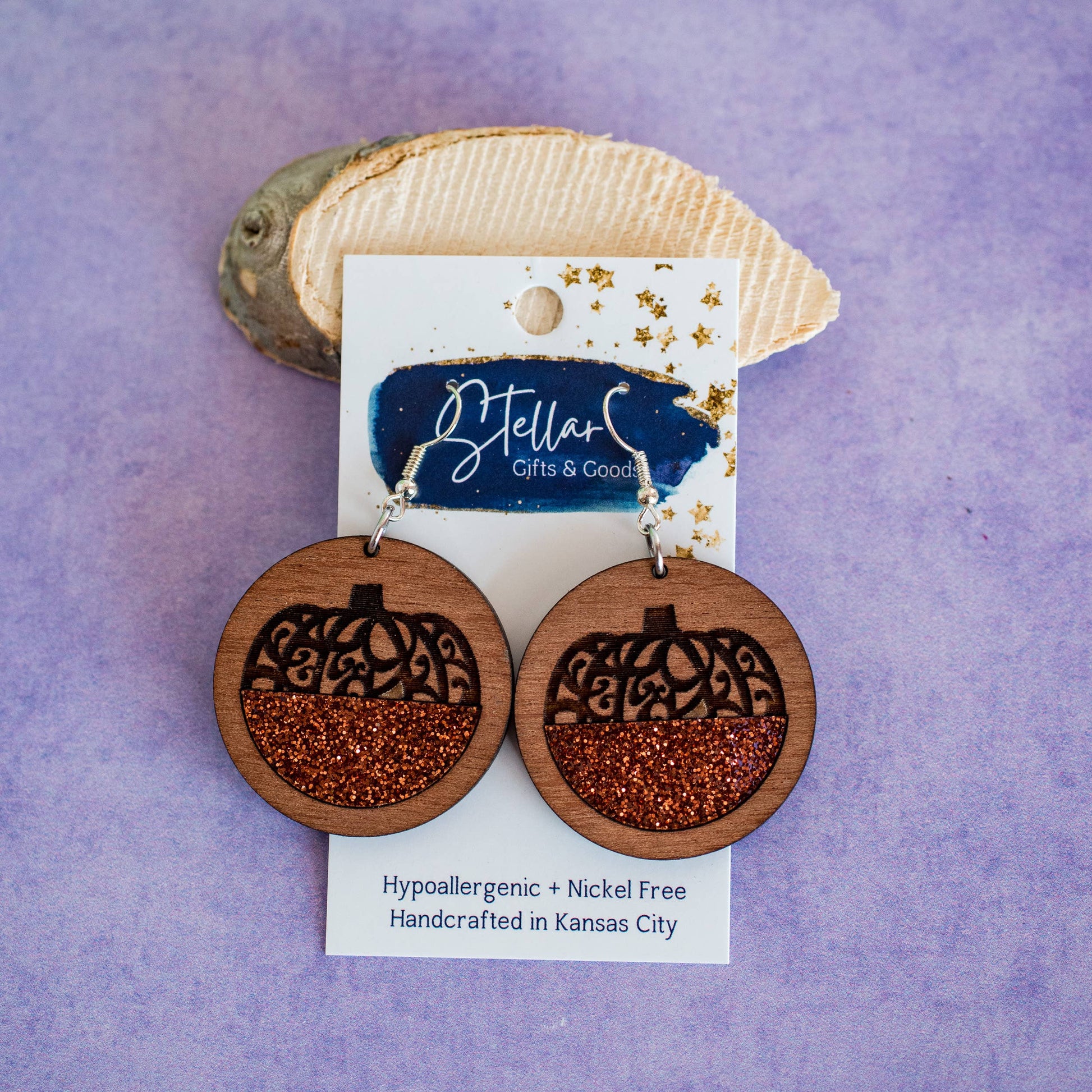 Filigree pumpkin spice glitter acrylic inset circle dangle earrings. 1.5 inch length. Great for sensitive ears!