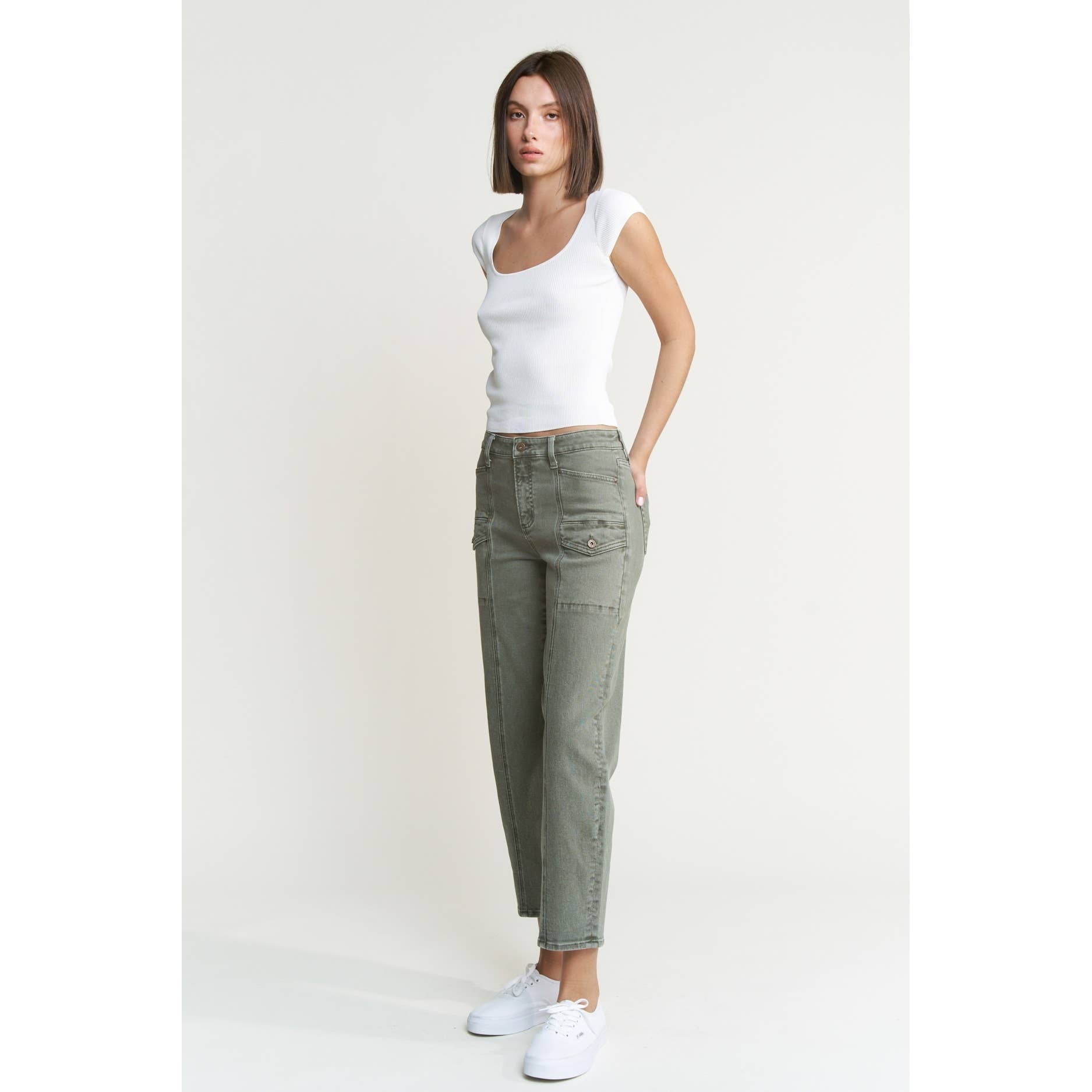 HIGH RISE TAPERED CARGO 97%COTTON, 3%SPANDEX FRONT RISE: 10 1/2" INSEAM: 28" LEG OPENING: 14 3/4"