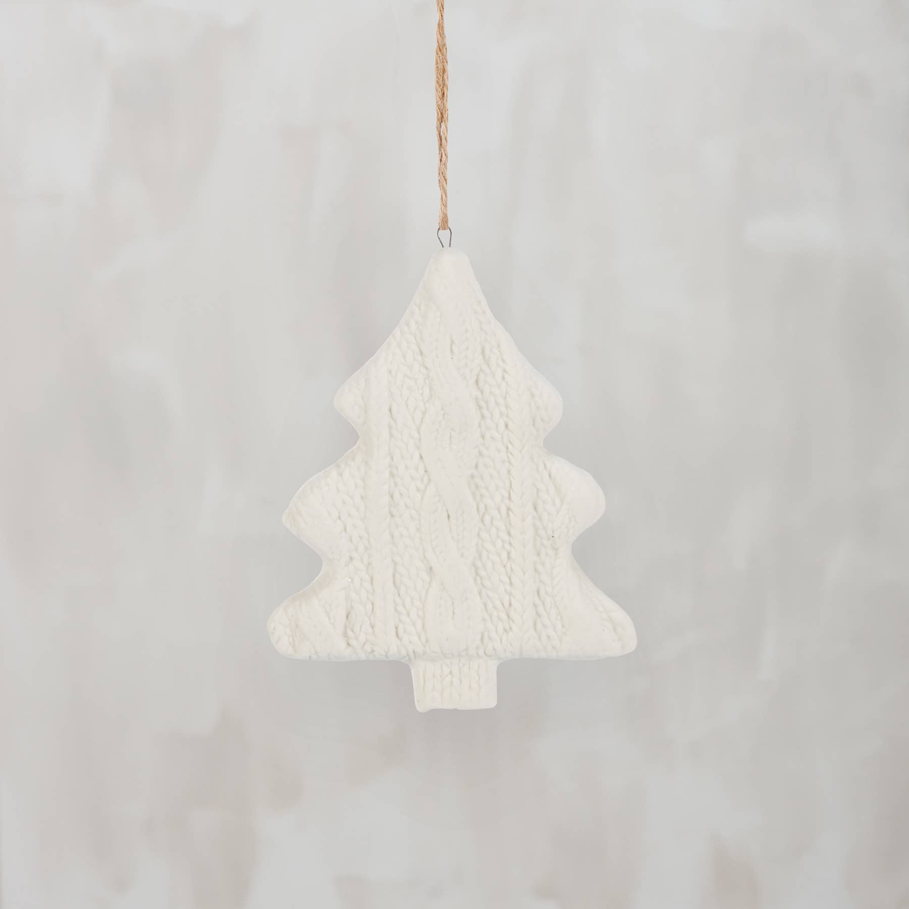 A decorative stoneware ornament from our Christmas Collection featuring a knitted mitten Christmas tree shape in a neutral color palette. Our Knitted Tree ornament is easy to hang via attached jute hanger. A neutral seasonal home accent.