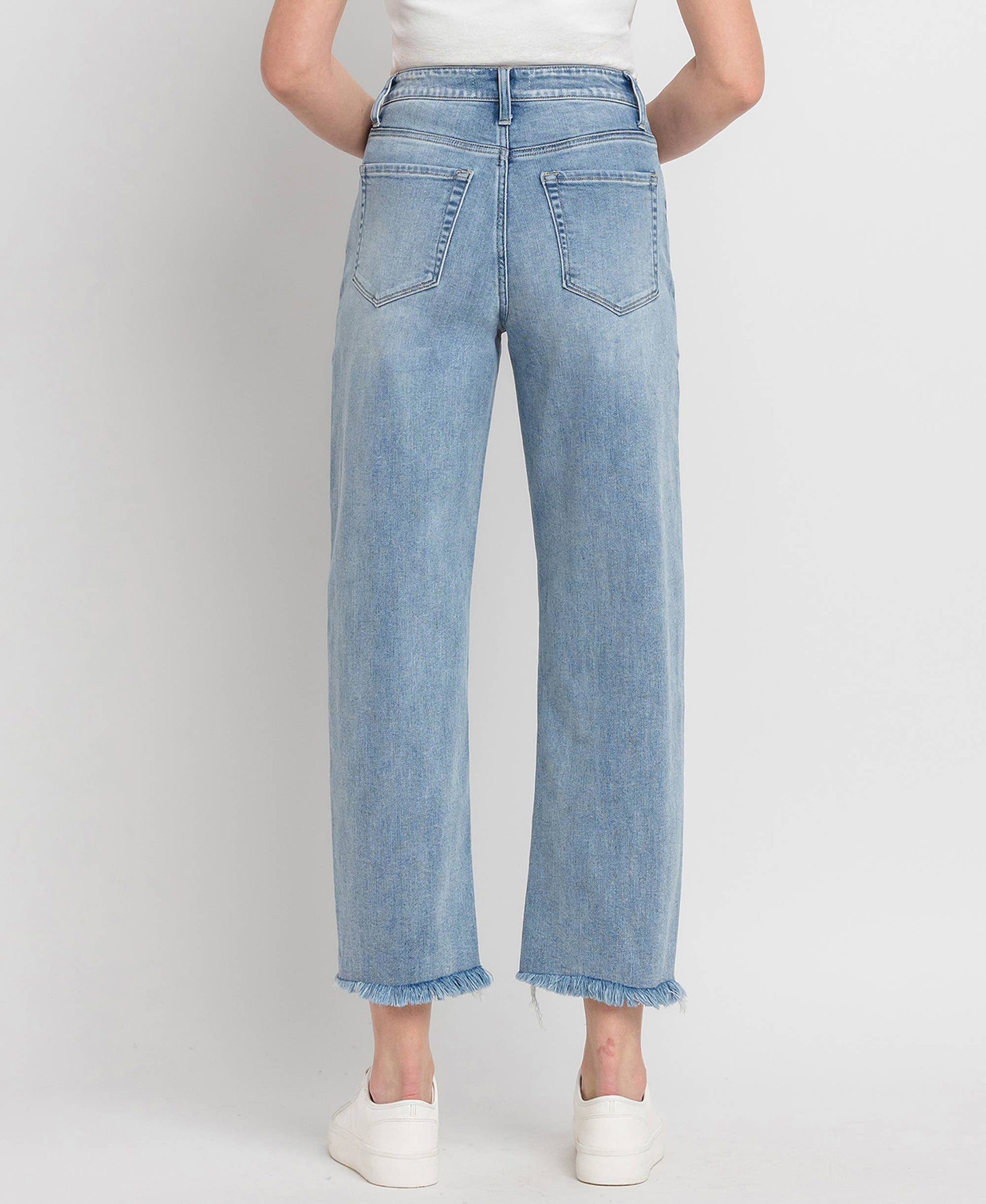 COMFORT STRETCH DENIM, SUPER HIGH RISE WAIST, SLIGHTLY DISTRESSED DETAIL, FRAYED HEM, CROPPED LENGTH, BARREL LEG JEANS