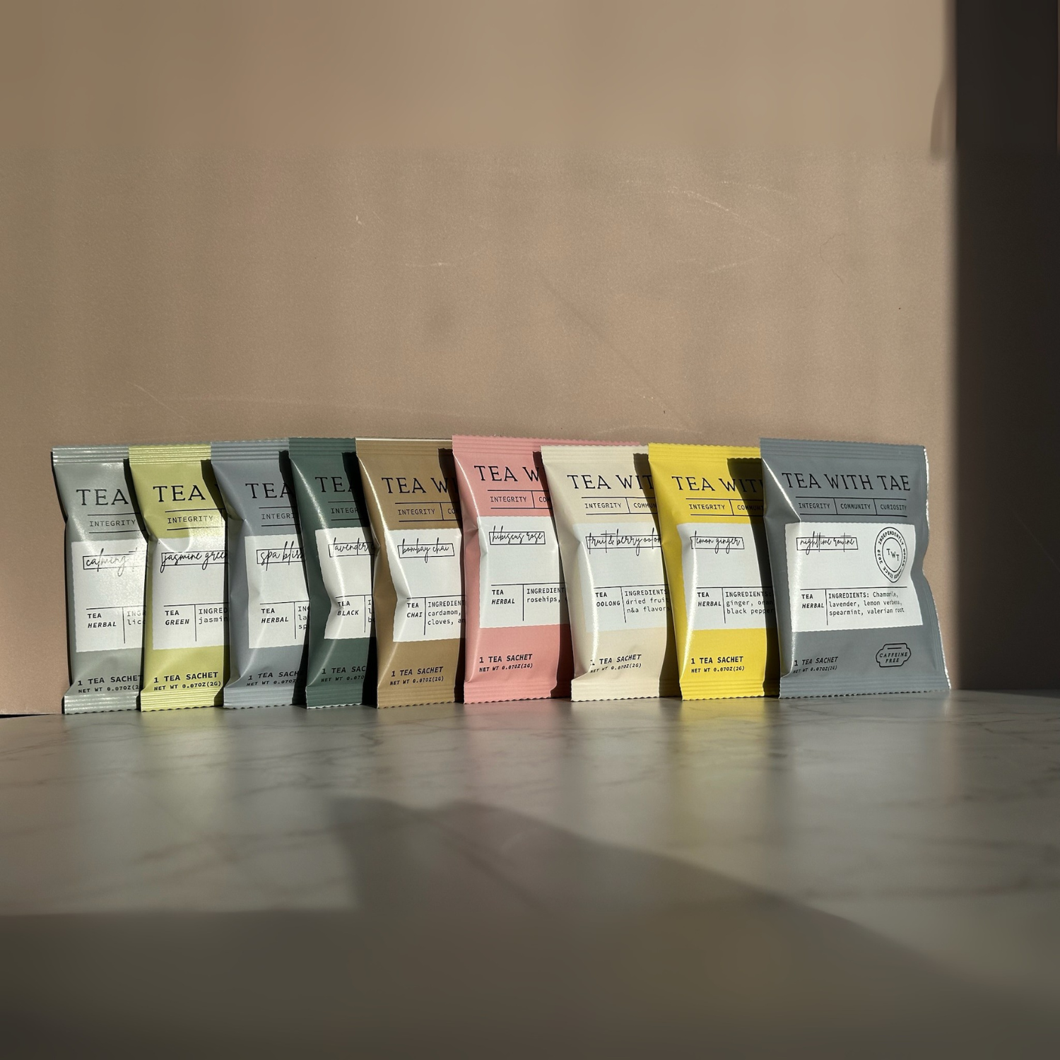 Sampler teas include: Spa Bliss, Lemon Creme, Lavender Earl Grey, Fruit & Berry Oolong, Genmaicha (Japanese green tea), and Lemon Ginger